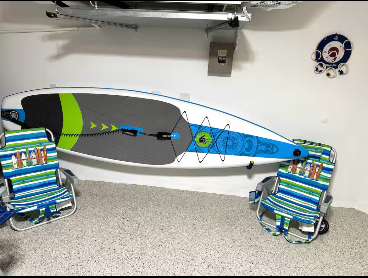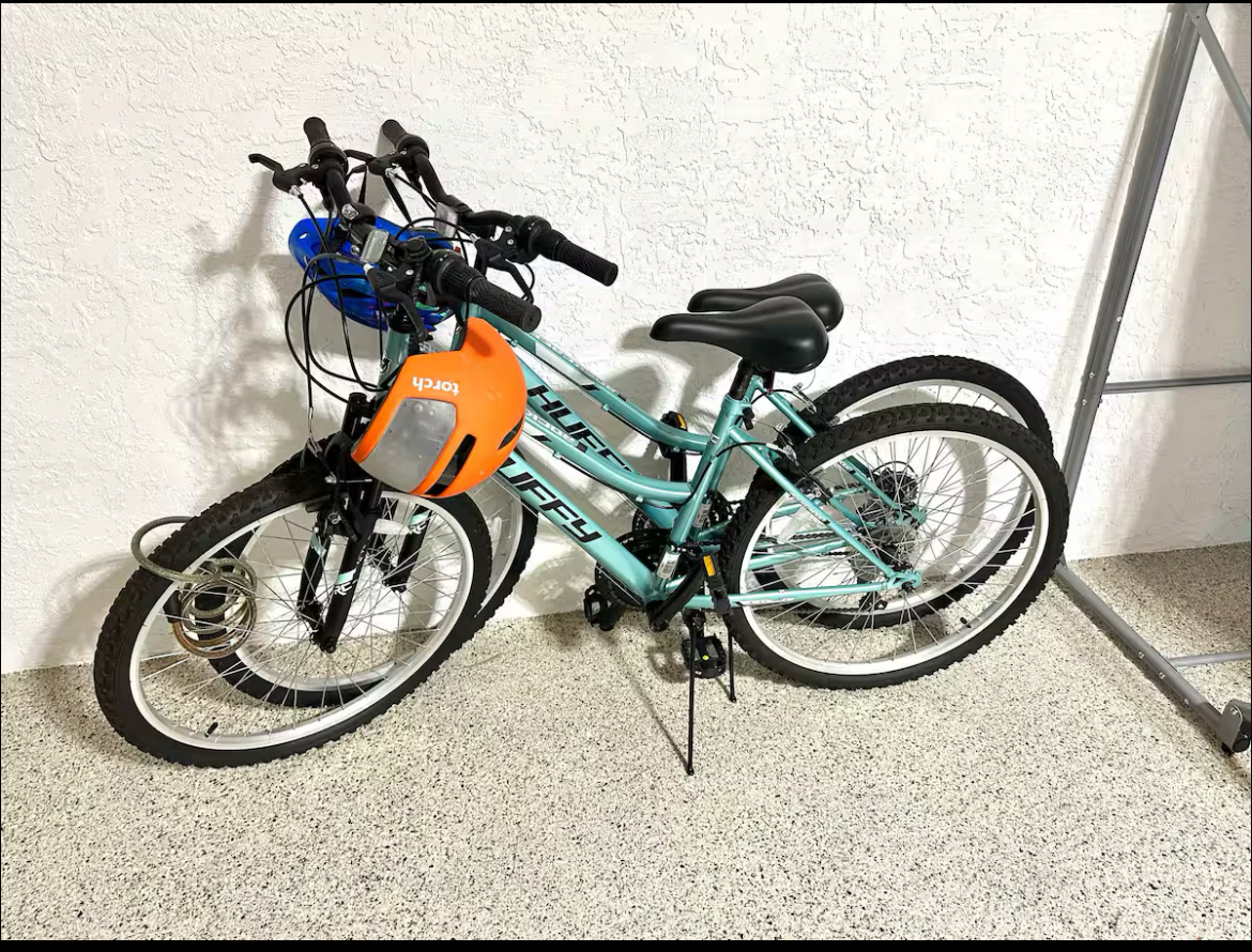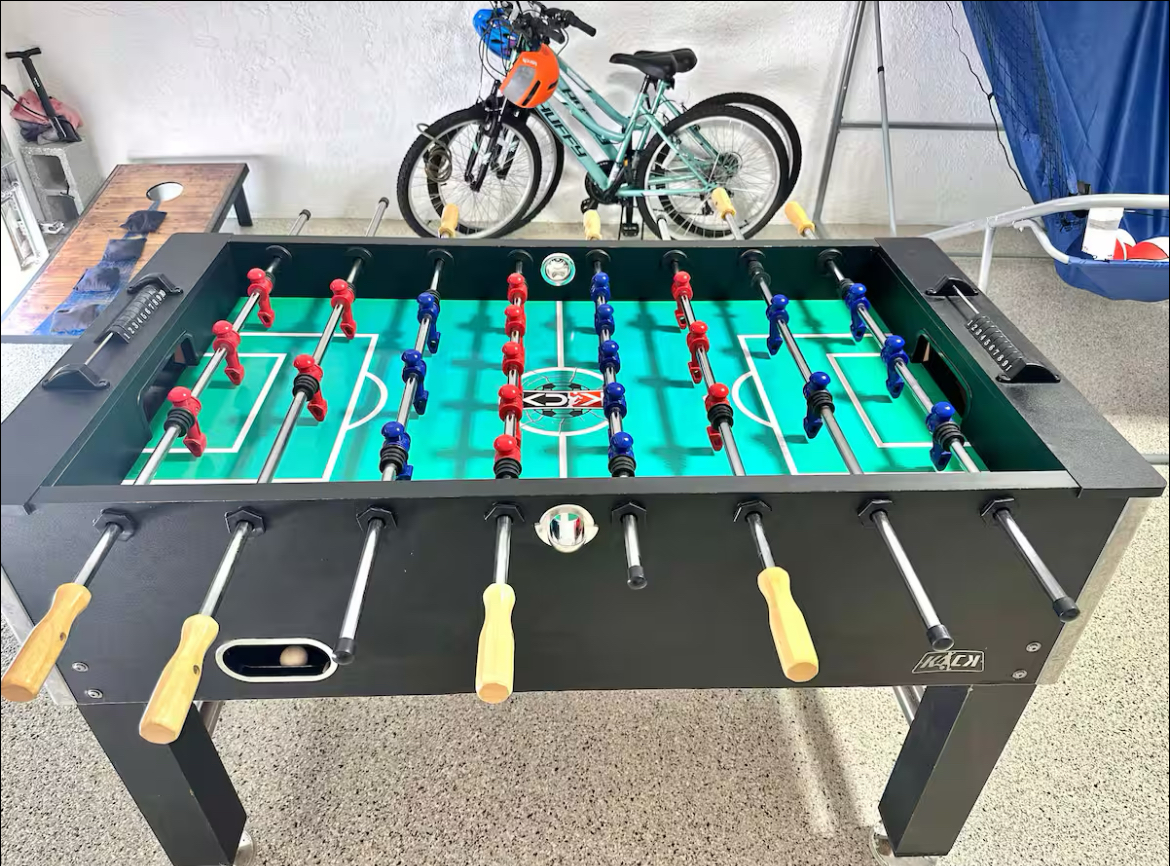 Inside, the home offers a fully equipped kitchen, large 75” smart TV, high-speed WiFi, washer and dryer, and a variety of games including ping pong, foosball, and cornhole. Two bikes are also included, making it easy to explore the surrounding area.