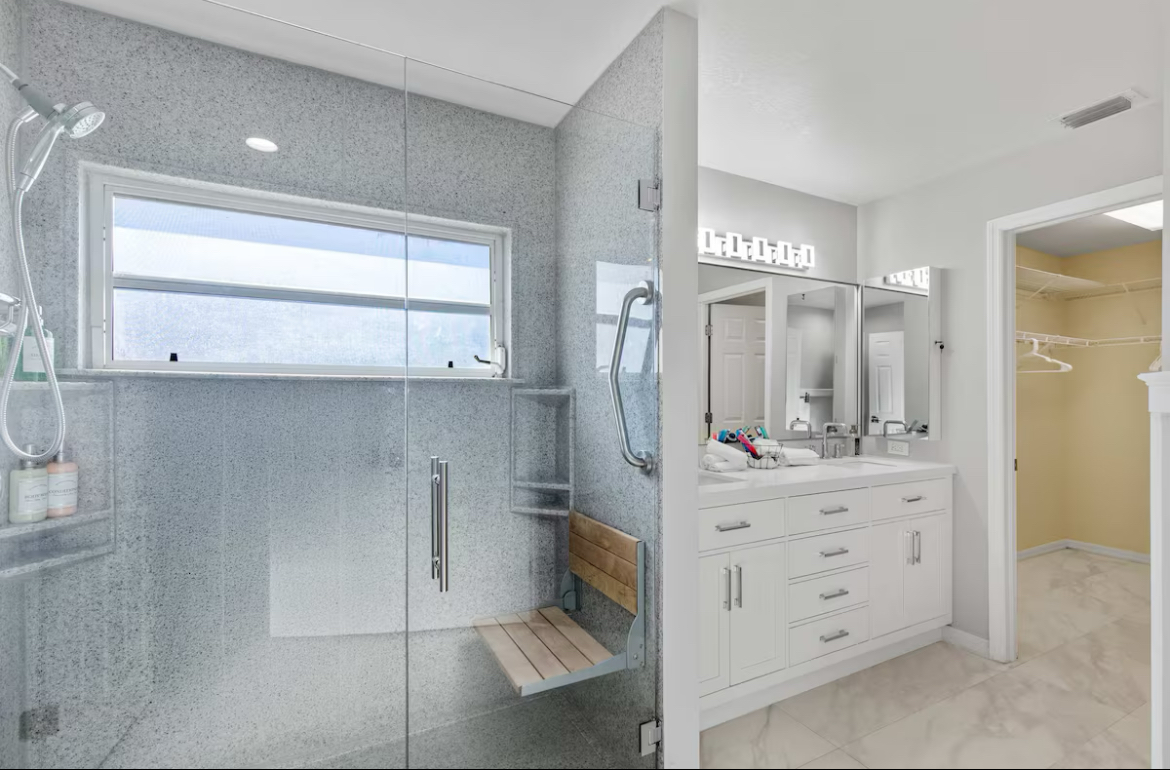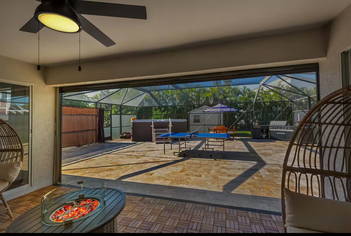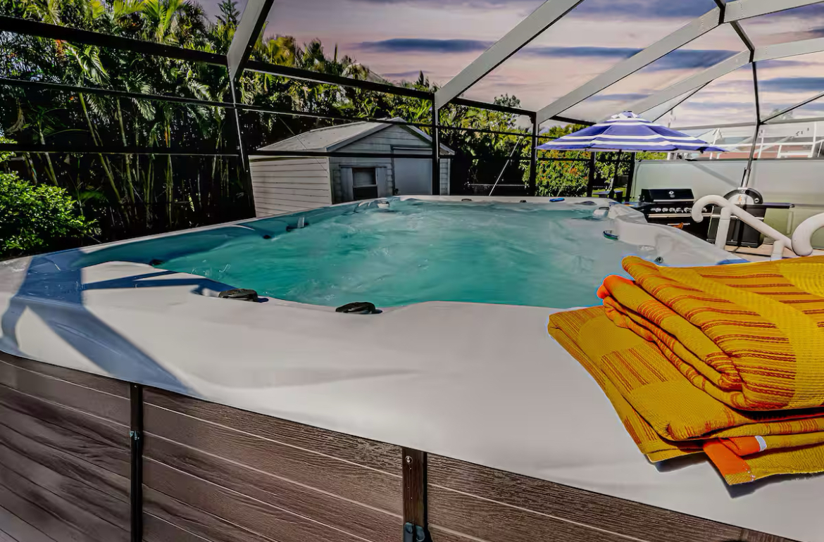 The highlight of the property is the private resort-style backyard. The oversized screened lanai creates a fully enclosed outdoor living space featuring a swim spa and hot tub, sun ledge with lounge seating, outdoor kitchen with BBQ and pizza oven, fire pit, and multiple areas to relax or entertain. Whether you are spending the day outside or winding down at night, this space sets the home apart from typical Cape Coral rentals.