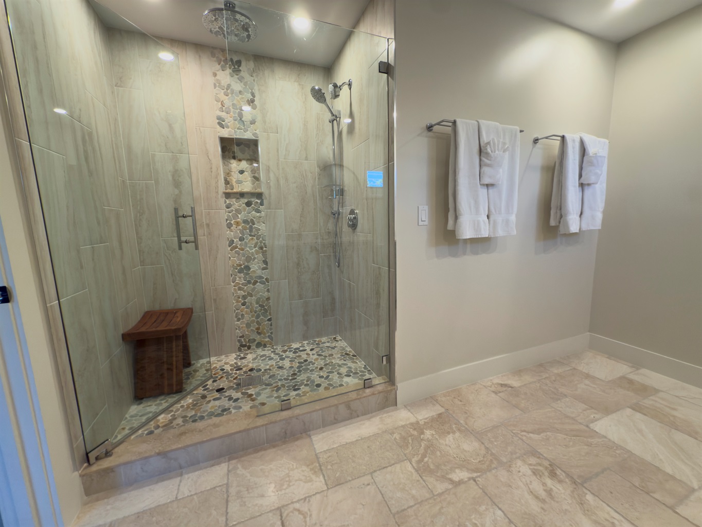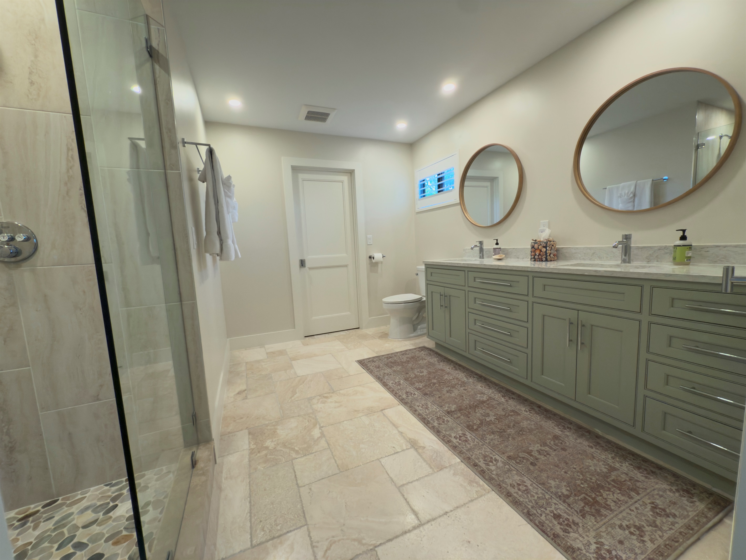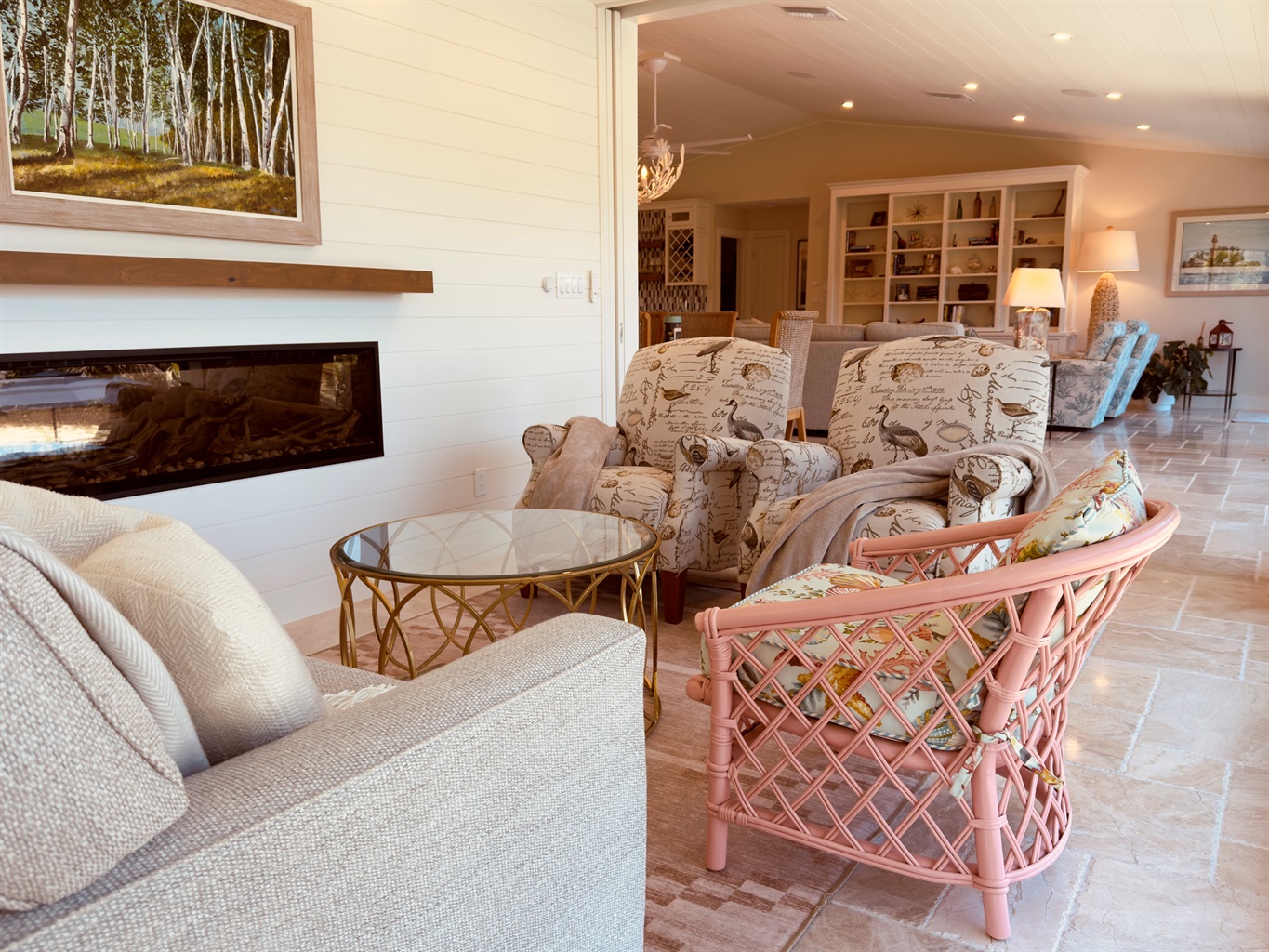 There are 2 large master bedrooms with walk-in closets and en-suite bathrooms and a guest bedroom with bunk beds and a queen bed. A third full bathroom is just outside the guest bedroom. All bedrooms complete with large flat screen TVs and cable. There is Sonos whole house audio inside and outside by the pool and outdoor dining area. The office can be closed off with a triple sliding pocket door and has an electric fireplace that also will heat the space if desired.